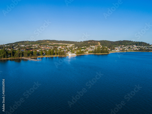 Cockle bay blue waters looking towards shore of Speers Point from aerial view