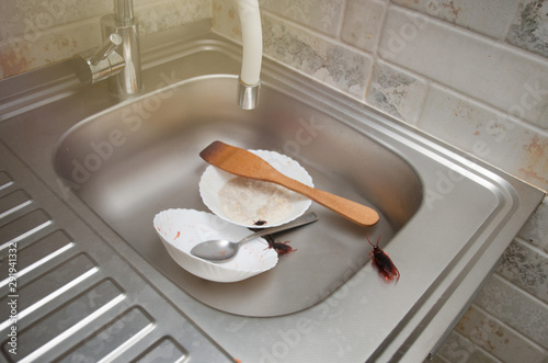cockroaches on dirty dishes in the kitchen. Poor hygiene
