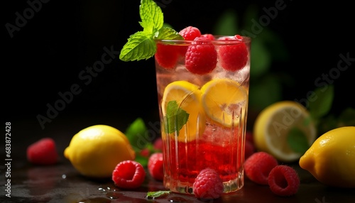 Cocktail with raspberries, lemon and mint on dark background, Raspberry lemonade with fresh raspberries and mint in a glass on a black background.