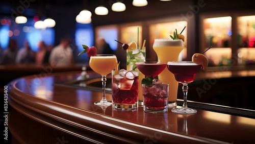 Cocktails drinks in bar with fruits on blurred background realistic illustration