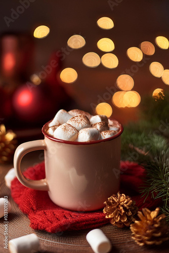 Cocoa with marshmallows in a Christmas cup. Cocoa with marshmallows in a Christmas cup. Hot chocolate with marshmallows