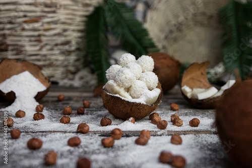 Coconut candy, balls, coconuts and hazelnuts on a rustic wooden surface