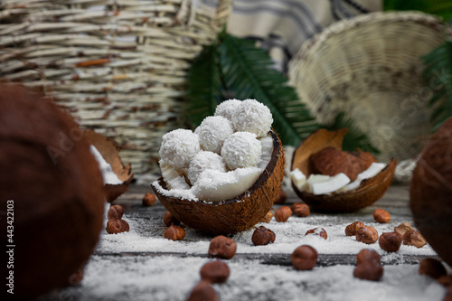 Coconut candy, balls, coconuts and hazelnuts on a rustic wooden surface