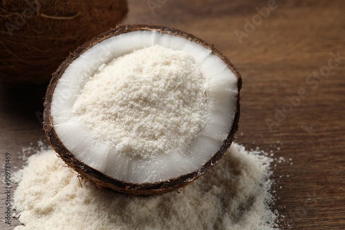 Coconut flour and fresh fruit on wooden table, closeup