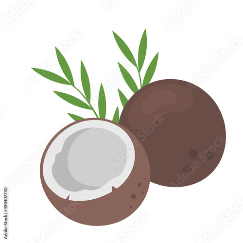 Coconut whole fruit and half sliced for package design. Ripe coconut fruit icon isolated on white background. Organic food, healthy nutrition, vegetarian product. Vector illustration.