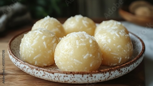 coconut, sweet, treat, dessert, snack, dish, plate, speckled, white, brown, round, smooth, creamy, delicious, sugary, tasty, deliciously, confection, confectionery, delicacy, food, cookery, culinary, epicure, nibble, munch, bite