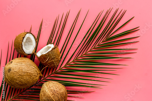 coconut, natural, tropical, vitamin, relax, nut, background, top, view, up high, food, leaf, leaf, cut, exotic, siam, asia, asian, palm, rest, vacation, fruit, shell, relaxation, spa, semitropical, trip, cookery, pink