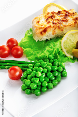 Cod fillet baked with cheese and onions with a garnish from an asparagus and green peas. On white background. High key. Selective focus.