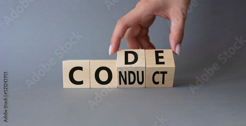 Code of conduct symbol. Businessman hand Turnes cubes and changes word Conduct to Code. Beautiful grey background. Business and Code of conduct concept. Copy space