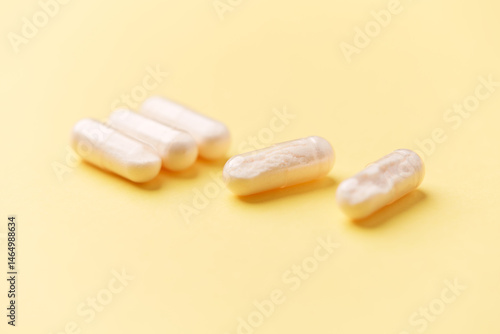 Coenzyme Q10 capsules. Antioxidants. Concept for a healthy dietary supplementation. Bright background. Soft focus. Close up. Copy space.