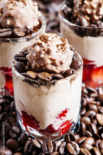 Coffee and chocolate dessert with ice cream and strawberries, se