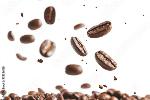 Coffee beans falling in the air isolated on a white background. Coffee beans flying , ai