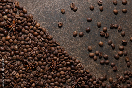 Coffee beans scattered on a textured brown background. View from above. Flat lay