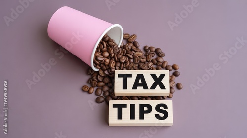 Coffee beans spill from a pink cup next to wooden blocks displaying important tax tips for financial planning