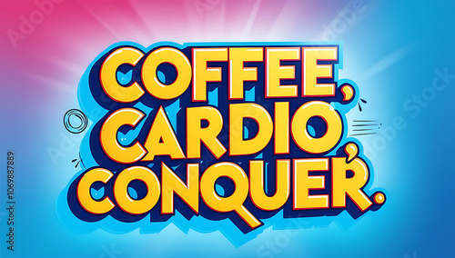 “Coffee, Cardio, Conquer” in energetic typography on a bright background.