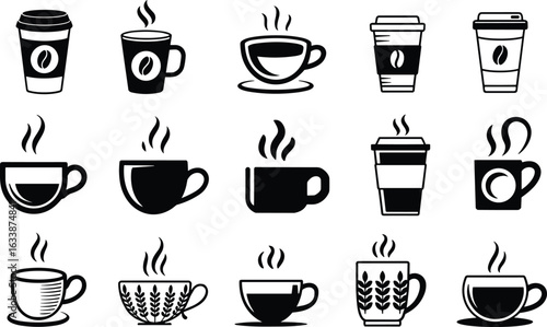 Coffee cup icon collection, cafe branding design, hot beverage symbols, steaming mugs, menu illustration, vector graphic, tea cup, drink art