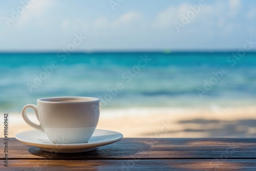 Coffee cup on the wooden table with blur beach background. A white coffee cup with saucer is placed on a table with the beach and ocean in the blurred background, with generative ai