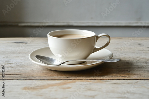 Coffee cup saucer spoon on wooden table simple morning beverage