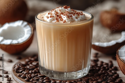 Coffee drink with coconut milk topped with whipped cream and chocolate sprinkles in a cozy setting