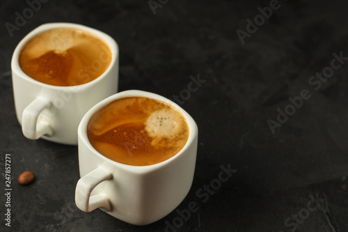 coffee freshly brewed in a white cup serving of beverage (coffee grain). food. top.copy save