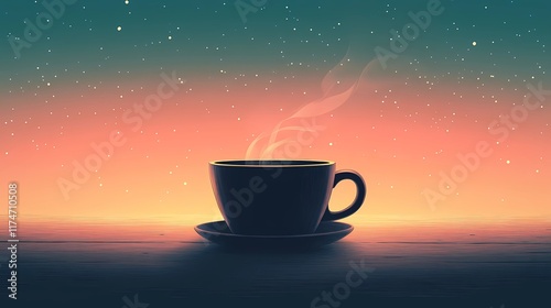 Coffee mug on a frosty table with snowflakes in the air, capturing the essence of winter, book illustration style