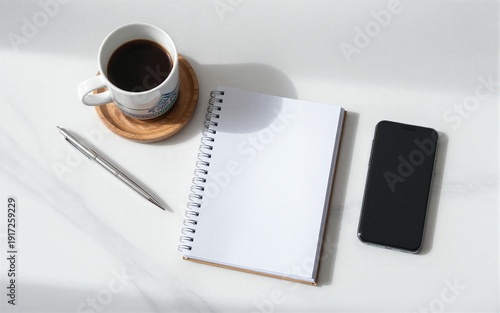 Coffee notebook pen and phone on clean deskquiet work setup.