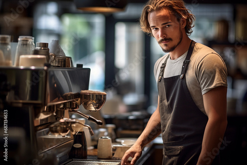 Coffee shop barista in action, natural candid expression, steam from the espresso machine