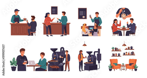 cafes, barista, client, cafes, menu, coffee machine, interaction, service, workplace, design element, illustration, people, activity, interior, food and drink, professional, industry, lifestyle, customer service