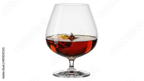 Cognac glass with splash isolated PNG on transparent background, amber liquor in snifter for bar and beverage concepts