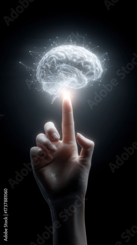 Cognitive Touch: A hand extends to touch a glowing representation of a brain, symbolizing the power of thought, innovation, and the limitless potential of the mind.