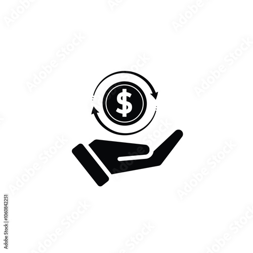 coin icon. cash back with dollar symbol in hand. The dollar coin is surrounded by two arrows forming a circle, indicating continuous movement. simple design style