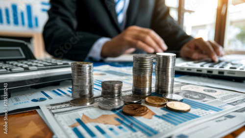 Coins stacked on financial charts with calculator - Close-up of increasing coin stacks on financial documents with a calculator and businessman in background