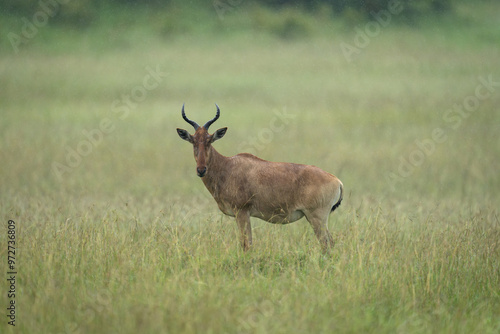 Coke hartebeest stands watching camera in rain