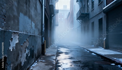 mist, fog, cold, alley, alleyway, urban, city, realistic, overcast, daylight, haze, grey, silver, blue, concrete, eerie, still, quiet, atmosphere, moody, surface level, soft light, weather, moisture, humidity, cinematic, depth, distant, urban scene, street, no people, lonely, mysterious, blurred, morning, perspective, isolation, industrial, realism, vapour, air, damp, shadow, environment, alleyway