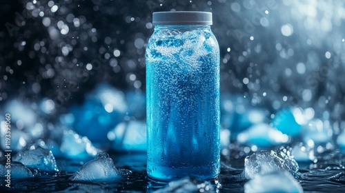 bottle, blue, beverage, bubbly, cold, ice, cube, water, drink, refreshing, fizzy, liquid, glacé, cool, transparent, plastic, container, summer, vibrant, chilly, crystal, sparkling, texture, background, studio, photo, product, image, design, marketing, advertising, commercial, visual, aesthetic, style, clean, purity, health, wellness, carbonated, glossy, shimmering, icy, fresh