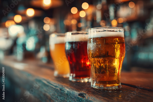 Cold glasses of beer in a bar. International beer day.