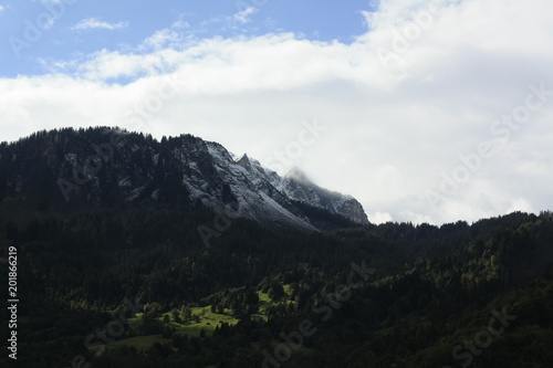 cold misty, foggy clouds on the mountains in the alps in Switzerland, Europe