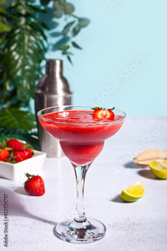 Cold strawberry margarita or daiquiri cocktail with lime and rum