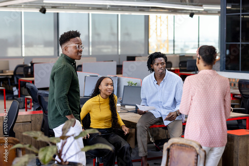 collaborating, office, african american, team, discussing, creative, business, idea, teamwork, collaboration, brainstorming, diversity, innovation, strategy, professional, co-worker, meeting, communication, planning, group, partnership, leadership, concept, design, technology, motivation, inspiration, success, growth, development, synergy, engagement, productivity, networking, vision, goal, corporate, modern, workplace, business meeting
