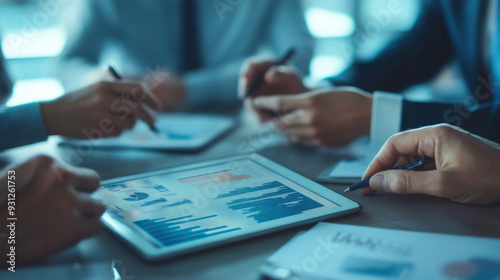 Collaboration and connection in the office, business people analyzing data on a tablet