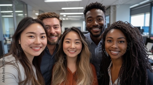 Collaborative Diversity Showcased in Office Setting: Five Individuals United by Smiles, Embracing Cultural Differences. Highlighting Cultural Diversity and Team collaboration concept.