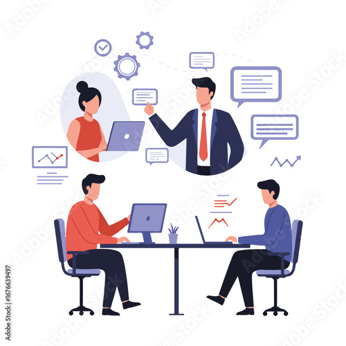 meeting, virtual, business, professional, collaboration, communication, teamwork, presentation, discussion, technology, online, employee, colleague, laptop, computer, office, strategy, productivity, efficiency, modern, flat, design, illustration, graphic, digital, businessperson, networking, corporate