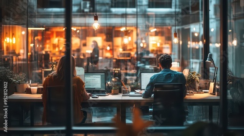 workspace, professional, teamwork, evening, dusk, warm, light, modern, design, computer, collaboration, atmosphere, urban, setting, productivity, sharpened, plant, hot drink, creative, environment, technology, laptop, interior, cosy, city, life, casual attire, meeting, brainstorming, networking, digital, office, space, ambience, lighting, culture, entrepreneurship, remote, work, dynamic, innovation, stylish, relaxation, business