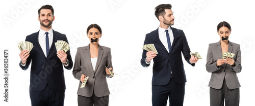 collage of businessman holding dollars near businesswoman with duct tape on mouth isolated on white, sexism concept