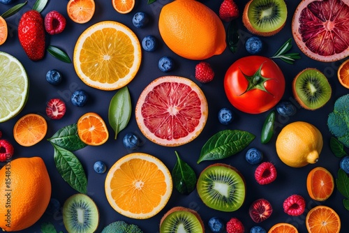 orange, lemon, lime, grapefruit, kiwi, strawberry, tomatoes, raspberry, blueberry, mandarin orange, leaf, green, red, yellow, blue, food, fruit, vegetable, healthy, fresh, colourful, pattern, background, texture, vibrant, juicy, delicious, vitamin, diet, nourishment, still life, overhead, closeup, macro, abstract, modern, contemporary, art, design, decor, wallpaper, poster, print, digital artwork, photo, image, graphic, illustration