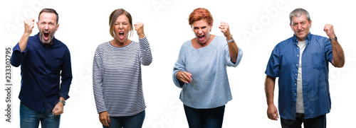 Collage of group of elegant middle age and senior people over isolated background angry and mad raising fist frustrated and furious while shouting with anger. Rage and aggressive concept.