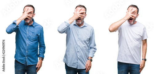 Collage of handsome senior hoary man standing over isolated background peeking in shock covering face and eyes with hand, looking through fingers with embarrassed expression.