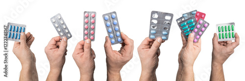 medicine, health care, isolated, hand, blister, pill, transparent, pack, hold, closeup, male, antibiotic, treatment, prescription, drug, red, blue, green, medicine, pharmacy, collage, therapy, cut-out, man, person, medication, remedy, vitamin, make well, tablet, drugged, painkiller, cephalalgia, group, adult, health care, pharmaceutical, pain, package, care, medicals, background, health, disease, object, addiction, disease, foil