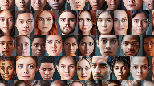 Collage of many diverse, multi-ethnic people's close-up headshots, showcasing their beautiful, attractive, and thoughtful expressions on a gray background.