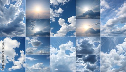 sky, photograph, collage, variety, weather, isolated, white, highlight, cloud, sunset, sunrise, storm, rain, snow, fog, clear, blue, grey, orange, pink, purple, dramatic, moody, serene, majestic, beautiful, captivating, tranquil, atmospheric, natural, scenic, skyline, peaceful, vibrant, dynamic